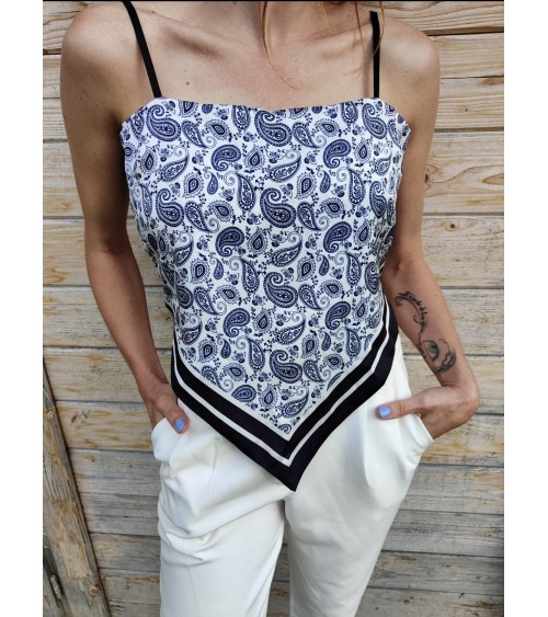 Ajouter au panier Top Damir Prix 46,00 CHF Top style bandana Imprimé mandalas Coloris bleu marine et blanc Bretelles ajustables Se noue à l'arrière Tissus satiné Fabriqué en...