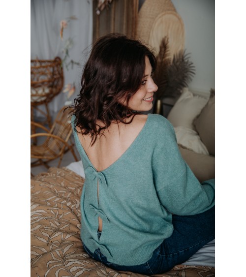 Ajouter au panier Pull Zahira Prix 56,00 CHF Pull fin Col rond Coupe ample Couleur vert d'eau Dos légèrement décolleté et ajouré d'une belle ouverture avec 3 nœuds Taille unique...