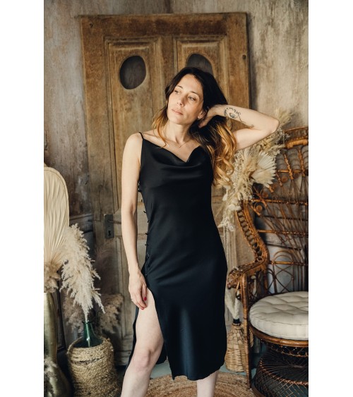 Ajouter au panier Robe Blake Prix 44,90 CHF La plus sexy de la collection pour casser les codes romantiques Robe noire mi longue Coupe droite Col drapé Ornée de boutons décoratifs...
