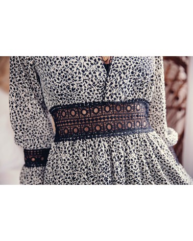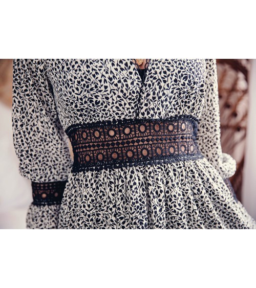 Ajourée d'un bel empiècement en dentelle noire qui ajuste la taille et les poignets