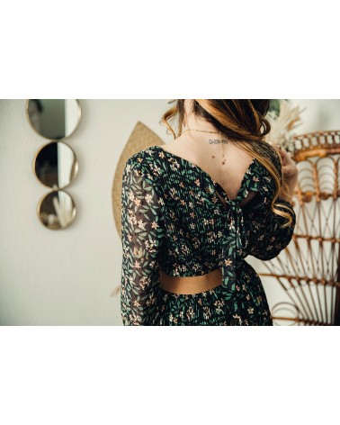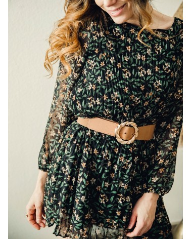 Robe courte plissée noire aux motifs floraux dans des tons vert et beige