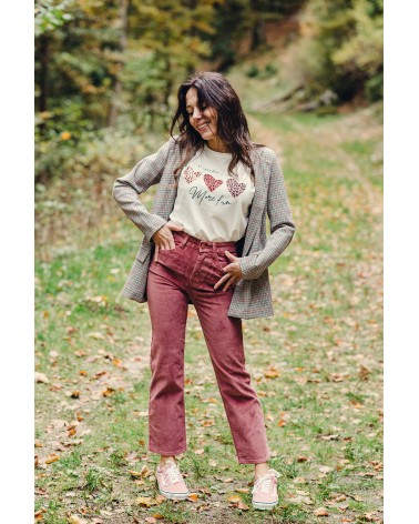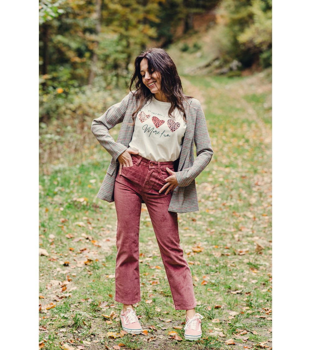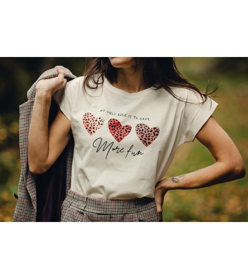 T shirt blanc  Taille unique convient du 34 au 42 Flocké avec 3 cœurs dans des tons terracotta et motifs léopard Inscription " more fun "...