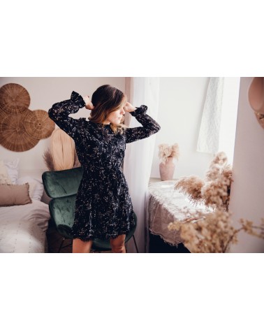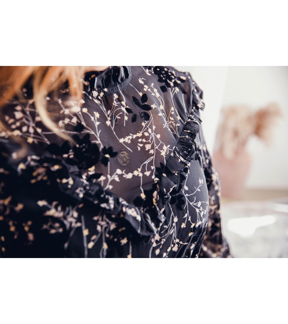 Effet décolleté dans un tissus transparent formant un V avec volants tout autour