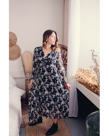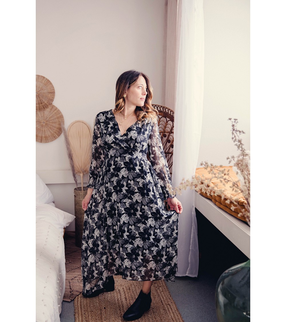 Découvrez Alexane , notre jolie robe longue à imprimé floral noir et blanc passe partout pour l'hiver