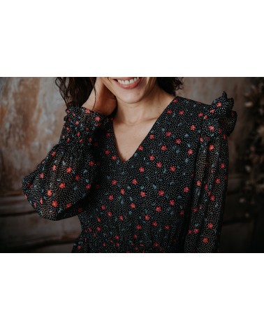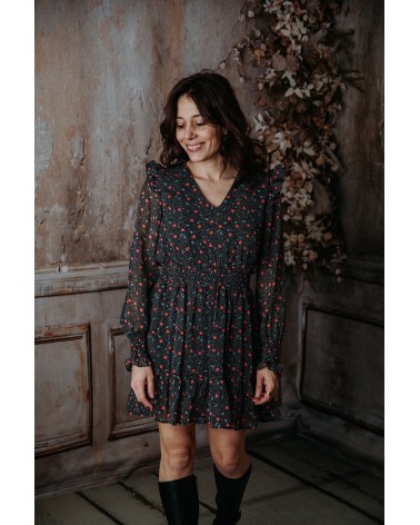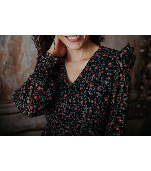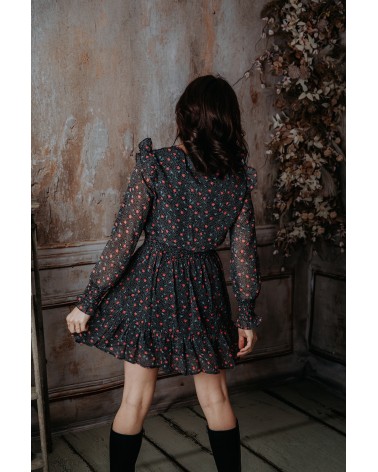 Tissus gris anthracite a imprimé floral ( fleurs blanches roses bleues )
